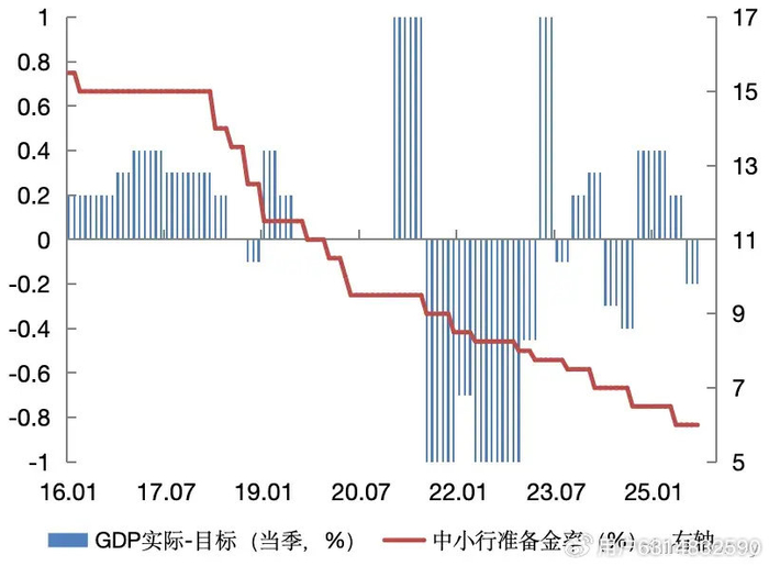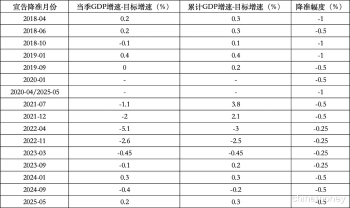 16次降準里,有11次發生在當季GDP增速不高于目標時,其他5次則可能與經濟預期偏弱和資本市場下跌有關。2018年4月至2019年1月,降準的背景是中美貿易摩擦、經濟預期走弱、股市下跌等;2024年1月的降準和穩股市有關;2025年5月降準時GDP增速有低于目標的風險。