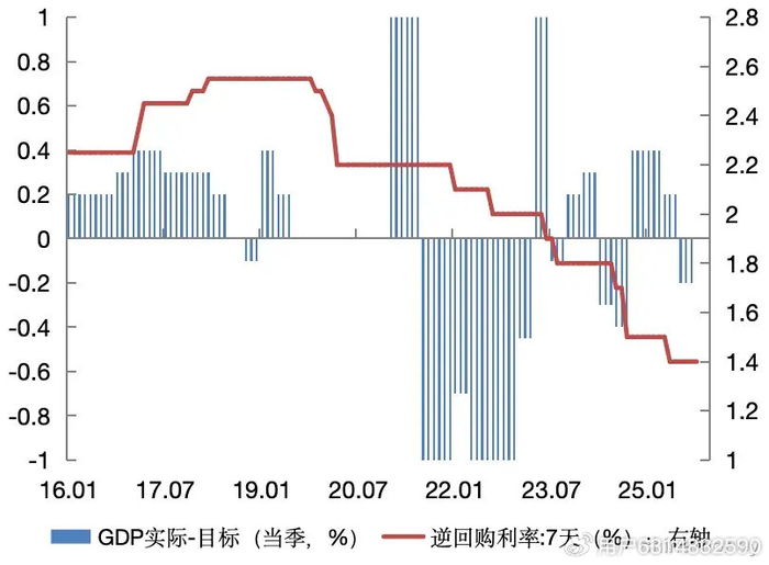 GDP增速低于目標不一定會帶來降息。2018年以來有六個時間段的GDP當季同比增速低于目標,分別是2018年3至4季度、2019年3季度至2020年4季度、2021年3季度至2023年1季度、2023年3季度、2024年2季度至3季度、2025年3季度,這六個時間段內央行降息幅度分別為0、0.35、0.2、0.1、0.3、0個百分點。