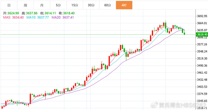 從黃金4小時圖看,昨日金價再度上攻未能取得成果,目前有轉身向下回調的跡象,4小時圖失守了中軌,打破了單邊的上漲力度,同時有進一步向下軌回踩需求。結合小時圖二次探高在3657附近二次承壓轉為回落,強勢行情是回踩再發力破高。一旦止住破高力度,就會走震蕩修正,綜合來看,今日黃金短線操作思路上賀博生建議反彈做空為主,回調做多為輔,上方短期重點關注3637-3647一線阻力,下方短期重點關注3600-3590一線支撐。