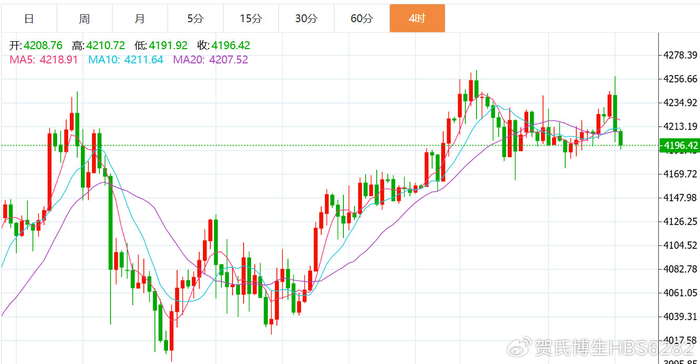黃金技術面分析:當前盤面來看,現貨黃金突破對稱三角形形態后維持橫盤整理,因缺乏后續買盤支撐,上行嘗試受阻于4260美元附近。4小時圖顯示,現貨黃金圍繞20期簡單移動平均線(SMA)震蕩,反映短期走勢呈中性。但整體上行趨勢仍未改變,回調大概率將吸引逢低買盤。上行方面,需明確突破4260美元才能重啟看漲動能,若突破有望上探4300美元關口,甚至可能測試4381美元附近的歷史高點。下行方面,初步支撐位于近期整理區間下沿4160-4170美元區間,進一步支撐為100期簡單移動平均線(SMA)附近的4141美元。綜合上述,下周開盤建議下方先留意4170.之上繼續看4220-4230區域或4250一帶,重點關注4160-4155區域。對于上方建議關注4240附近可以嘗試空,重點關注4260-4265區域。綜合來看,黃金下周短線操作思路上賀博生建議以反彈高空為主,回踩低多為輔,上方短期重點關注4225-4245一線阻力,下方短期重點關注4175-4155一線支撐。