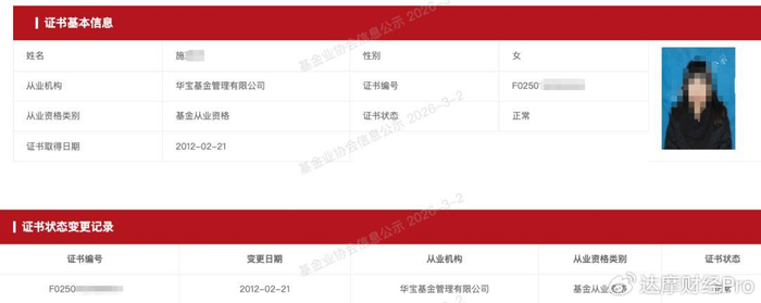 基金業協會信息顯示,胡某朋友圈中提及的施某自2012年2月加入華寶基金,目前仍在華寶基金任職。