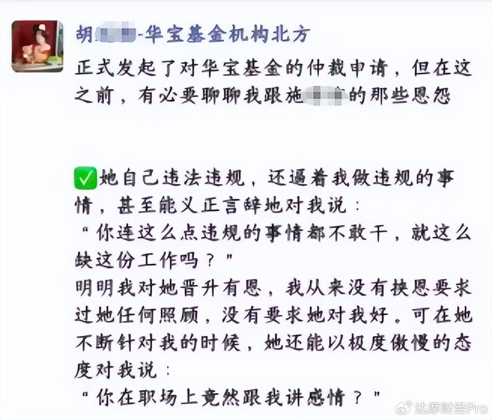 據胡某自述,她已正式向華寶基金發起仲裁申請,主張被克扣的工資、年終獎以及精神和身體傷害的補償,并強調自己掌握了對方違規的證據。