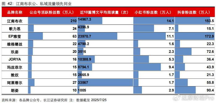 經過多年運營,江南布衣的全渠道流量在行業中保持領先。長江證券研報顯示,截至2025年7月,公司的公眾號活躍粉絲數達210萬人,小紅書粉絲數為14.1萬人,抖音粉絲數達153.5萬人,均在同業中處于領先地位。
