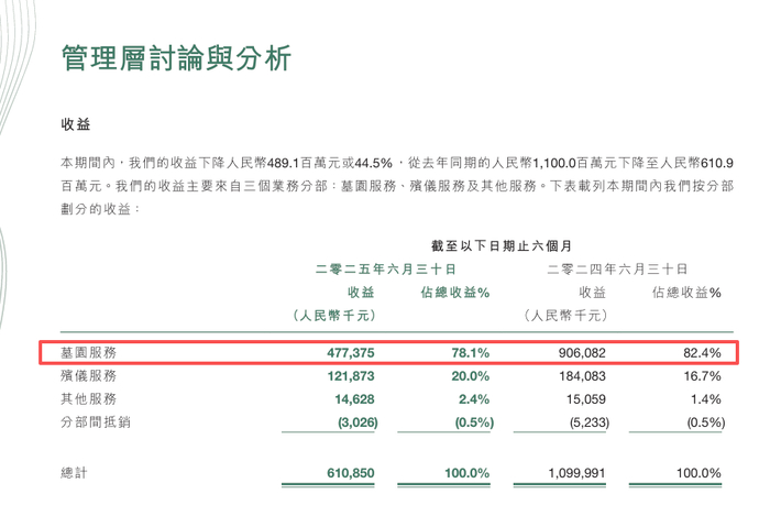 然而,2025年中期財報給出了一個令市場錯愕的答案:凈虧損2.6億元。這是福壽園上市12年來的首次虧損。與此同時,經營性墓穴均價從12.12萬元直接腰斬至6.34萬元。