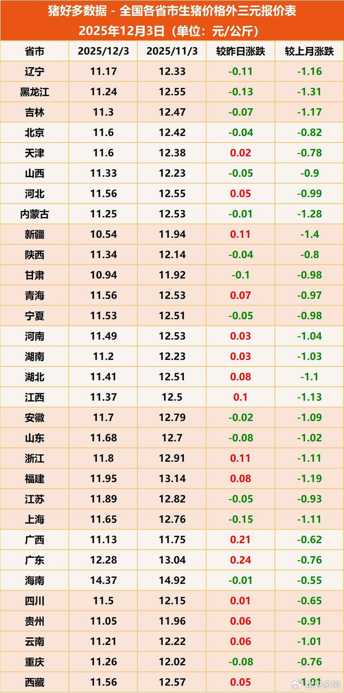 首先,我們先來看一下今日最新豬價行情:據豬好多數據監測顯示,12月3日全國外三元生豬均價為11.54元/公斤,較昨日上漲0.01元/公斤。12月初,豬價行情雖然成功實現3連漲,但是從單日漲幅由0.08元/公斤到0.06元/公斤,再到0.01元/公斤,很明顯豬價上漲動力不足,后續漲勢也難以持續。