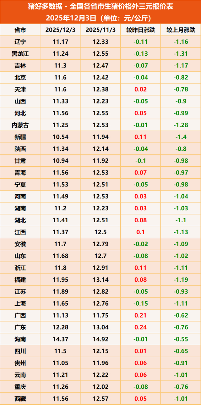 首先,我們先來看一下今日最新豬價行情:據豬好多數據監測顯示,12月3日全國外三元生豬均價為11.54元/公斤,較昨日上漲0.01元/公斤。12月初,豬價行情雖然成功實現3連漲,但是從單日漲幅由0.08元/公斤到0.06元/公斤,再到0.01元/公斤,很明顯豬價上漲動力不足,后續漲勢也難以持續。