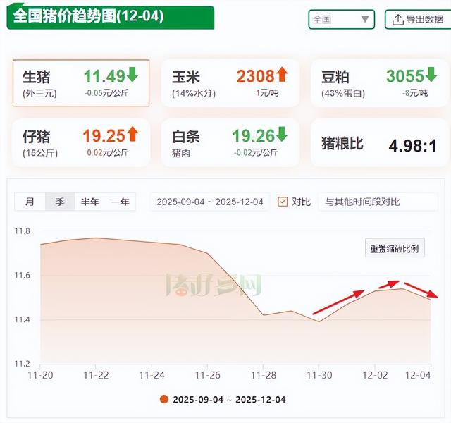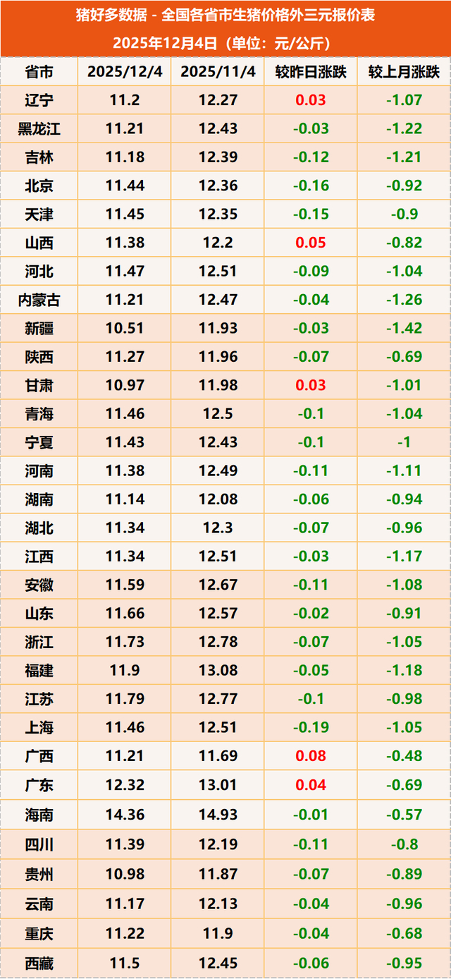 從養(yǎng)殖端來看,12月份生豬出欄壓力會(huì)形成 “洪峰”,或?qū)⒊掷m(xù)壓制價(jià)格反彈。反映到生豬行情上,今日豬價(jià)止步“3連漲”!據(jù)豬好多數(shù)據(jù)監(jiān)測顯示,12月4日全國外三元生豬均價(jià)為11.49元/公斤,較昨日下跌0.05元/公斤,月初的豬價(jià)漲幅已經(jīng)開始“回吐”,后續(xù)難有大幅上漲。