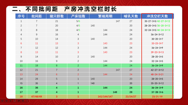 楊碧泉表示,想要確保選擇的批次能走下去,需結(jié)合豬場欄位數(shù)量、人員配置、生產(chǎn)目標(biāo)綜合決策。假設(shè)產(chǎn)房不分組,4-6間產(chǎn)房同時(shí)空出來需要沖洗時(shí),對員工素養(yǎng)要求非常高,整體難度系數(shù)會(huì)增加。