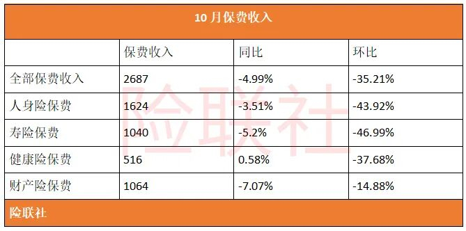從10月份單月看,保費收入2687億,而9月份為4147億。10月單月,人身險保費收入1624億,9月份為2896億,其中壽險保費收入1040億,而9月份為1962億,健康險保費收入516億,而9月份為828億。