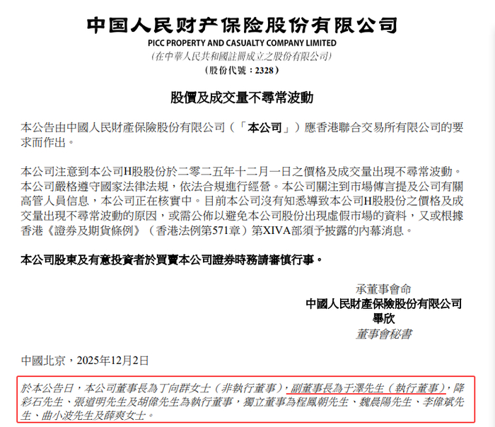12月2日晚間,中國人民財產(chǎn)保險股份有限公司在港交所發(fā)布公告,就其H股中國財險前一交易日的異常波動作出回應(yīng)。