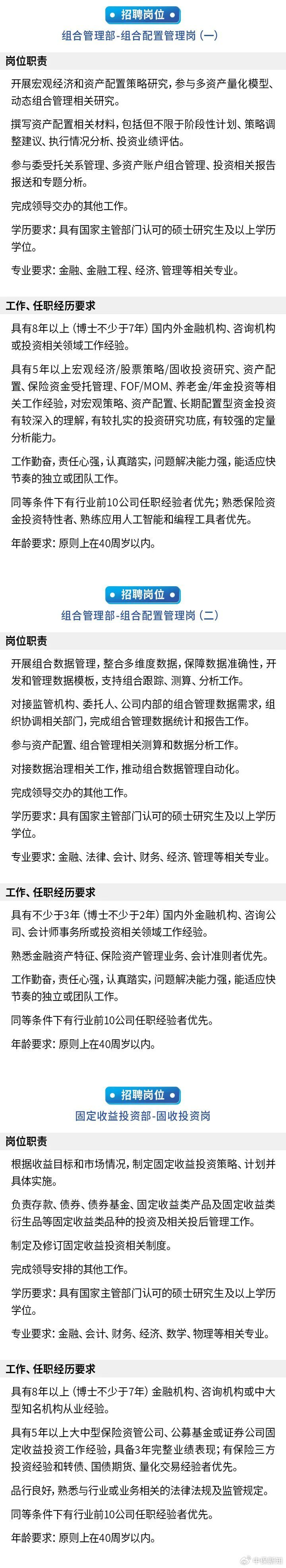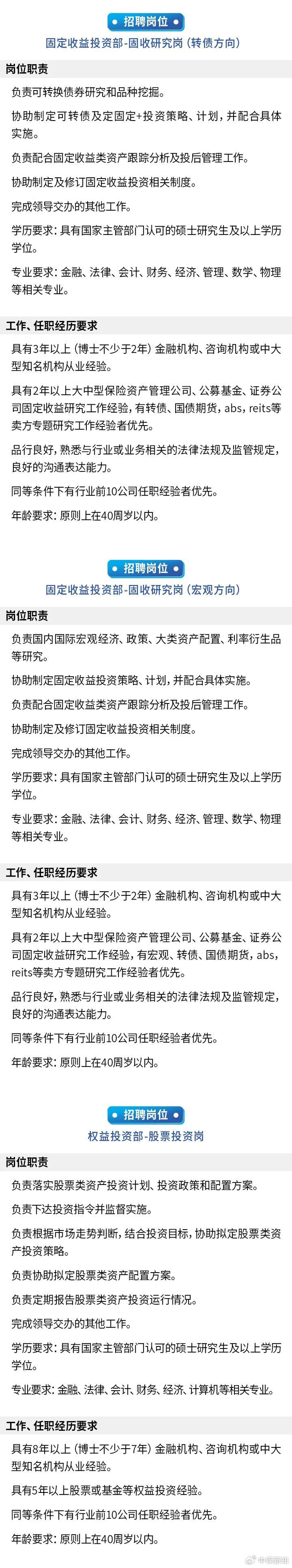 固定收益投資部:固收投資崗、固收研究崗(轉債方向)、固收研究崗(宏觀方向)。