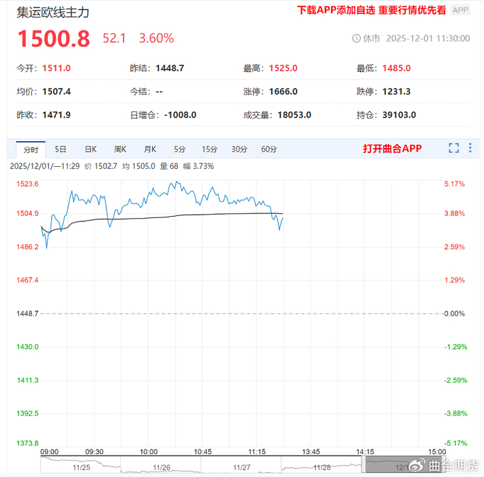 12月1日早盤收盤,集運歐線主力合約上漲3.60%,收于1500.8點。盤面對紅海復航預期有所消化,加沙停火協議進度僵持,近月大面積復航可能性預計偏低,船司陸續調降12月上半月報價,不過至1月期間仍有宣漲可能性,02合約或震蕩運行,遠月合約或因復航預期而更承壓。