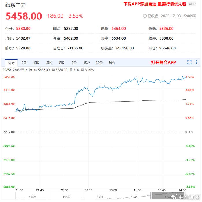 混沌天成:12月2日主力合約凈空單減少2515手,資金推動成為短期上漲主因。第二,外盤提價強化成本支撐,海外闊葉漿廠下半年陸續(xù)公布減產(chǎn)計劃,疊加北歐港口庫存下降至78萬噸(-5.2%),推動12月外盤報價上調(diào)20-30美元/噸。進口成本攀升傳導至國內(nèi),11月我國紙漿進口量環(huán)比下降8.3%,到港價折算人民幣約5300元/噸,與期貨價格形成倒掛。