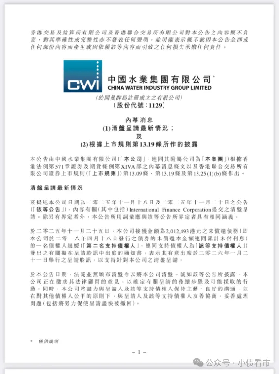 公告稱,呈請針對中國水業集團一筆金額為2.17億元的未償還本金而提出,呈請將于2026年1月21日舉行聆訊。