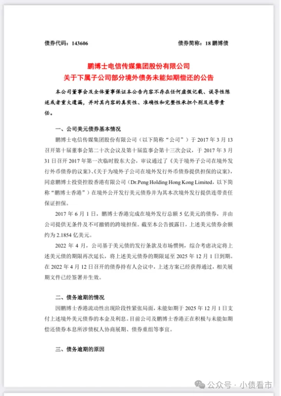 12月4日,鵬博士電信傳媒集團(tuán)股份有限公司(以下簡(jiǎn)稱(chēng)“鵬博士”)公告稱(chēng),下屬子公司鵬博士投資控股香港有限公司(以下簡(jiǎn)稱(chēng)“鵬博士香港”)未能如期于2025年12月1日支付境外美元債券的本金及利息。