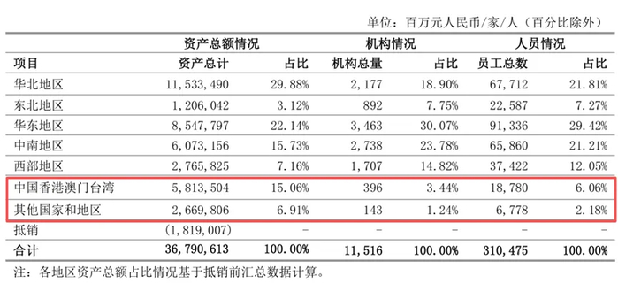 截至2025年6月末,在中國香港澳門臺灣及其他國家和地區,中國銀行有分支機構539家,覆蓋全球64個國家和地區,占全行機構數的4.68%;有員工25,558人,占全行的8.24%。