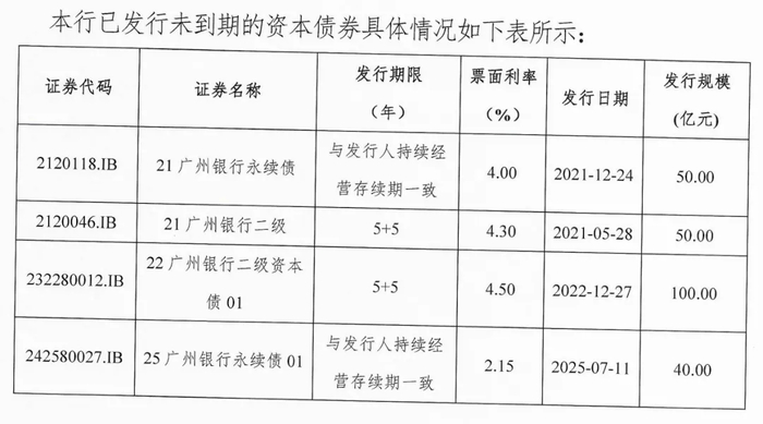 近年來,廣州銀行已開始通過資本工具來提升資本實力和風險抵御能力。今年7月11日,成功發行40億元2025年無固定期限資本債券,票面利率2.15%,本次募集資金將全部用于補充廣州銀行其他一級資本。截至2025年9月末,廣州銀行資本債券余額為人民幣240億元。