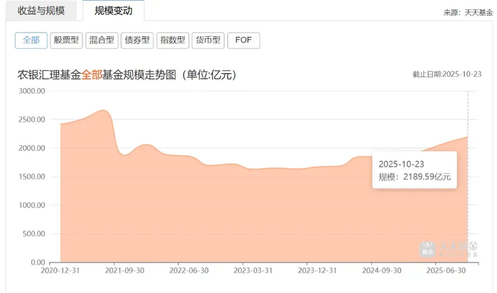 在其成立后的十余年間,農(nóng)銀匯理的管理規(guī)模穩(wěn)步增長,至2021年6月末達(dá)到2679.79億元的峰值,行業(yè)排名位列第24位。但此后規(guī)模持續(xù)回落,截至2025年10月23日,合計規(guī)模為2189.59億元,較峰值減少490.2億元。行業(yè)排名下滑至第37位,在銀行系公募中位列第11位。