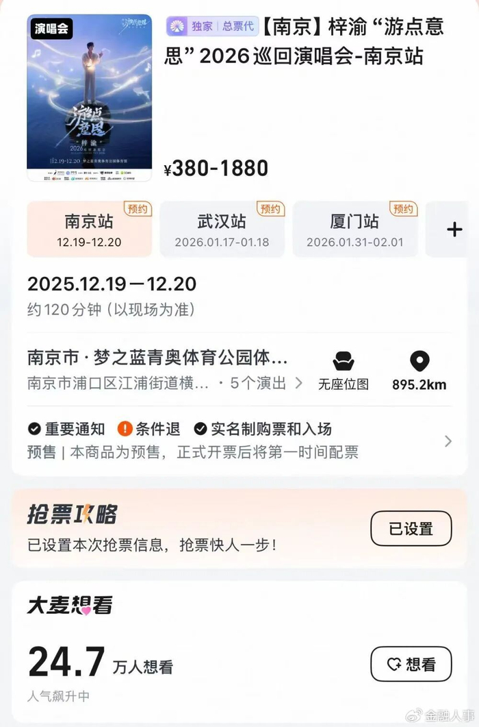 12月2日,新晉藝人梓渝官宣2026“游點意思”巡回演唱會的前三個城市和票價體系,南京、武漢、廈門三站連開,380元至1880元的六檔票價,短短時間內南京站大麥預約量突破20萬。