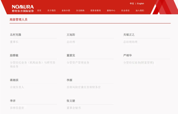 此外,野村國際(香港)有限公司總裁、野村亞太控股執行CEO、野村集團中國委員會執行主席關塚正之,已任野村東方國際證券總經理助理。目前,官網高管名單已更新。