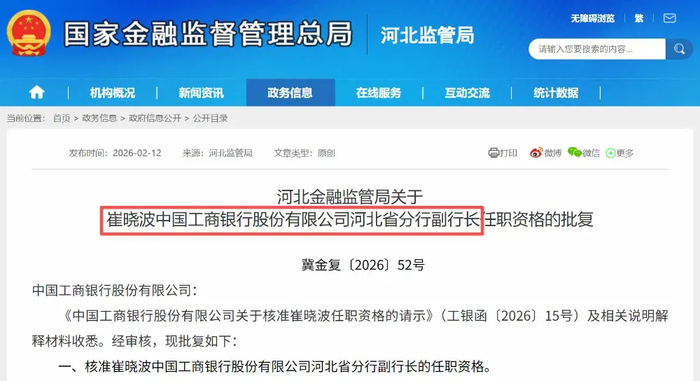 2026年2月12日,崔曉波工行河北省分行副行長的任職資格獲準;歷任工行商丘分行副行長、信陽分行行長、河南省分行投資銀行部總經理,2024年8月任河北省分行風險官。
