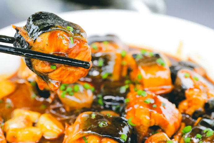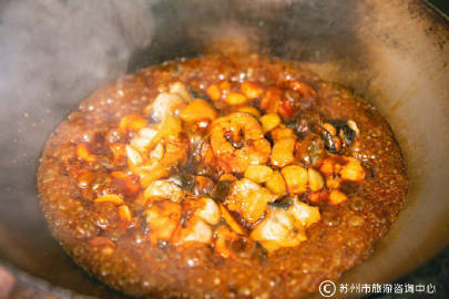 黃燜河鰻是蘇州秋季名菜之一。做黃燜河鰻,講究先用大鍋烹制,再換小鍋以小火慢煨,如此反復方能使河鰻入味且酥爛。鰻皮肥腴,魚肉軟糯粉嫩,口味咸香中略帶甜味,讓人回味無窮。