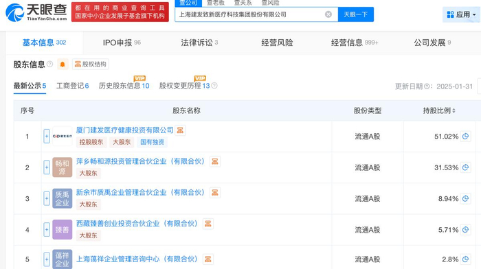 本次上市前,建發(fā)致新的控股股東為建發(fā)醫(yī)療,持股比例為51.02%。其中,建發(fā)集團(tuán)直接及間接持有建發(fā)醫(yī)療100%的股權(quán),為建發(fā)致新的間接控股股東。同時(shí),萍鄉(xiāng)暢和源持股31.53%,新余質(zhì)禹持股8.94%,西藏臻善持股5.71%,上海藹祥持股2.80%。