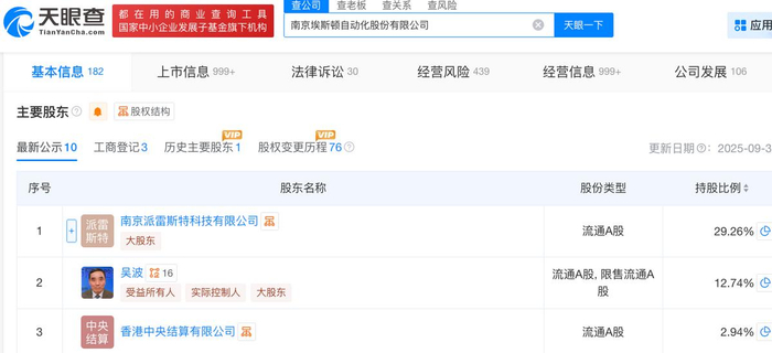 天眼查App信息顯示,埃斯頓成立于2002年2月,前稱為南京埃斯頓數字技術有限公司。目前,該公司的注冊資本約為8.67億元,法定代表人為吳波,主要股東包括南京派雷斯特科技有限公司、吳波等。