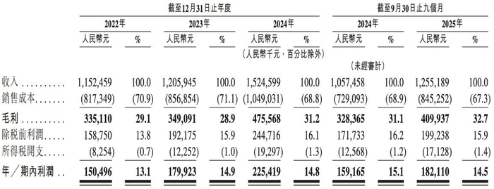 2022年、2023年、2024年度和2025年前九個月(前三季度),兆威機電的營收分別約為人民幣11.52億元、12.06億元、15.25億元和12.55億元,凈利潤分別約為 1.50億元、1.80億元、2.25億元和1.82億元。