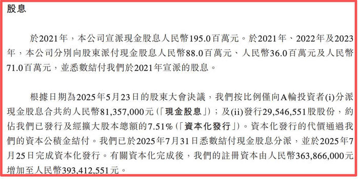 而2025年5月,創想三維按比例向A輪投資者分派現金股息合計8135.7萬元。同期,向A輪投資者發行29,546,551股股份,公允價值約為1.59億元,占其已發行及經擴大股本總額的7.51%,均于2025年7月完成。