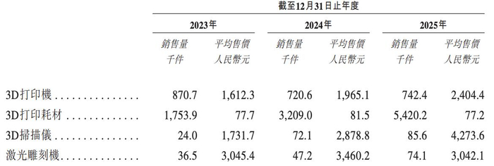 創想三維在招股書中表示,截至2025年12月31日,除3D打印機外,創想三維也分別提供超過400個增值配件SKU、超過1400個3D打印耗材SKU以及超過10個3D掃描儀及激光雕刻機SKU。
