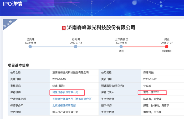 2022年6月15日,本所受理了濟南森峰激光科技股份有限公司(以下簡稱發行人)首次公開發行股票并在創業板上市的申請,曹冬、曹文軒為項目保薦代表人。