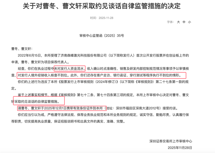 鑒于上述事實和情節,根據《審核規則》第七十二條、第七十四條第三項的規定,本所上市審核中心決定對曹冬、曹文軒采取約見談話的自律監管措施。
