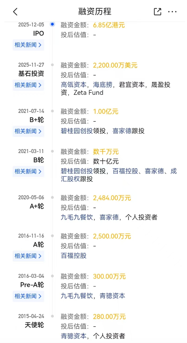 - 資本背書:九毛九、喜家德、碧桂園創投、高瓴、海底撈等參投