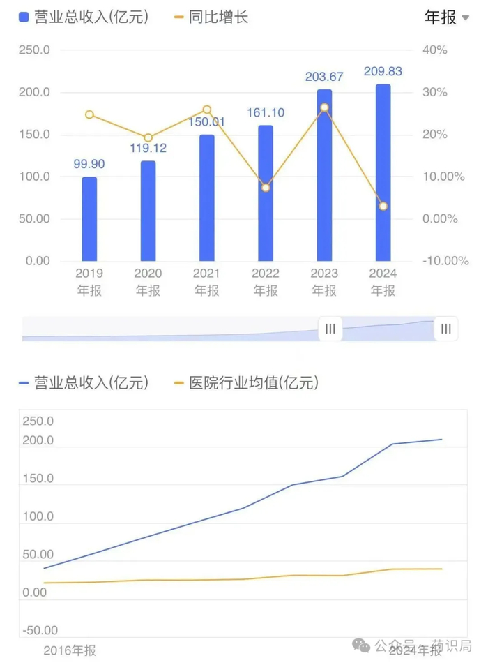 但轉折來了。2024年,愛爾眼科持續多年的高增長態勢驟然放緩。這一年,其實現營業收入209.83億元,同比僅增長3.02%;歸母凈利潤35.56億元,同比增長5.87%;扣非歸母凈利潤30.99億元,同比下滑11.82%。