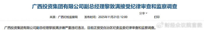 2025年11月21日,廣西紀委監委宣布,廣西投資集團有限公司副總經理黎敦滿涉嫌嚴重違紀違法,目前正接受自治區紀委監委紀律審查和監察調查。