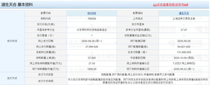 2025年09月19日,道生天合材料科技(上海)股份有限公司(以下簡稱“道生天合”、“公司”)進行了首次公開發行股票并在主板上市招股意向書的公告,此番IPO中,道生天合的保薦人(主承銷商)為中信建投證券股份有限公司,承銷方式為余額包銷。發行人律師為北京市金杜律師事務所;審計機構為天健會計師事務所(特殊普通合伙);預計發行日期為2025 年9月29日。