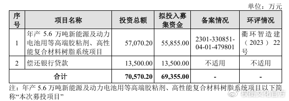 此番公司募資用于年產5.6 萬噸新能源及動力電池用等高端膠粘劑、高性能復合材料樹脂系統項目和償還銀行貸款,擬投入募集資金達69,355萬元。