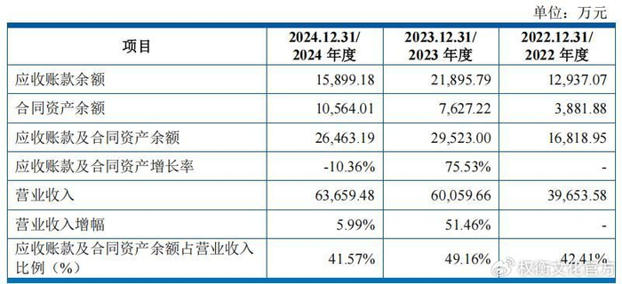 報告期各期末,公司應收賬款及合同資產的賬面余額分別為1.682億元、2.952億元和2.646億元,占營業收入的比例分別為42.41%、49.16%和41.57%。公司應收賬款及合同資產余額較大,主要為驗收款和質保金。
