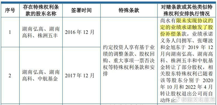2016年12月增資涉及的特殊股東權利及其終止,因尚水有限未能完成《A輪增資補充協議》中約定的業績承諾條款,觸發了《A輪增資補充協議》中約定的股份補償條款。2019年12月9日,股份補償義務人金旭東、閆擁軍、張曙波按照《A輪增資補充協議》的約定,與湖南弘高、湖南高科、株洲五豐簽署了《股權轉讓協議書》,金旭東、閆擁軍、張曙波合計向湖南弘高、湖南高科、株洲五豐無償轉讓了2.08%的尚水有限股權。