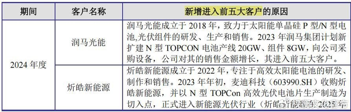 2023年,公司新增前五大客戶分別為通威股份、正泰集團、中潤光能和鈞達股份,2024年公司新增炘皓新能源和潤馬光能。