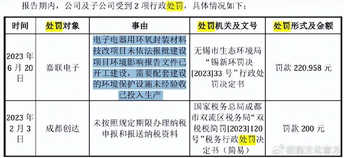 報告期內,公司及子公司受到2項行政處罰,主要為2023年6月20日嘉聯電子電子電器用環氧封裝材料技改項目未依法報批建設項目環境影響報告文件已開工建設,需要配套建設的環境保護設施未經驗收已投入生產。