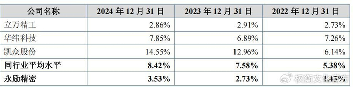 報告期各期,永勵精密研發費用分別為1,628.68萬元、1,933.31萬元和1,966.30萬元,占當期營業收入的比重分別為3.92%、3.80%和3.46%,低于同行業可比公司的平均水平6.04%、6.25%和4.86%。