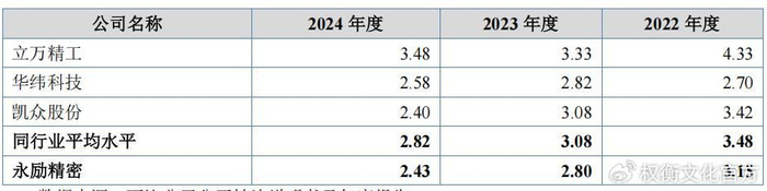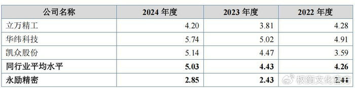 報告期內,永勵精密存貨周轉率分別為2.44、2.43和2.85,低于同行業平均水平4.26、4.43和5.03,主要由于公司對原材料及半成品儲備量較高,同時由于發出商品規模相對較高,致使公司存貨周轉率低于同行業平均水平。