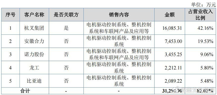 嘉晨智能主要客戶為工業(yè)車輛整車制造廠商,包括杭叉集團(tuán)、安徽合力、諾力股份、龍工、柳工、比亞迪、江淮銀聯(lián)、徐工等。報(bào)告期內(nèi),公司前五名客戶收入占營業(yè)收入的比例分別為87.05%、87.71%和82.02%,客戶集中度較高。