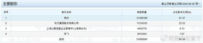 截至招股說明書簽署日,公司第一大股東姚欣直接持有公司31,300,346股股份,占公司股本總額的61.37%;姚欣直接持有公司股東上海眾鼎82.07%的出資份額,通過上海眾鼎間接持有公司7.17%的股份,并擔(dān)任上海眾鼎的執(zhí)行事務(wù)合伙人。姚欣直接及間接合計(jì)持有公司68.54%的股份。