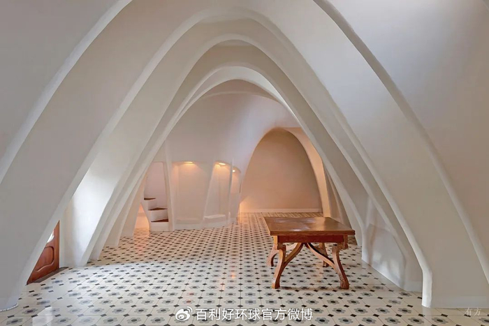 而最具功能美學(xué)代表性的,莫過于頂層的閣樓。這里原本用作洗衣房和儲物間,高迪卻用一連串純白的懸鏈拱門構(gòu)筑空間,其造型既像恐龍的脊椎,又似巨龍的腹腔,結(jié)構(gòu)輕盈堅固,展現(xiàn)了仿生結(jié)構(gòu)的力學(xué)之美。屋頂平臺則是奇幻故事的終點,除了標志性的龍脊,那些色彩斑斕、造型流暢的煙囪群,實則為防止空氣倒灌而設(shè)計,再次印證了高迪“藝術(shù)服務(wù)于生活”的理念。