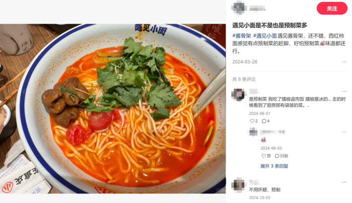 但標準化也帶來相應的代價。當全面推行中央廚房模式,所有面條遵循相同流程,部分調料和澆頭采用預制備方式,遇見小面實質已成為“預制面”,難以與重慶街頭的小面店相提并論。就像麥當勞的漢堡,無論在哪座城市,味道都高度統(tǒng)一。