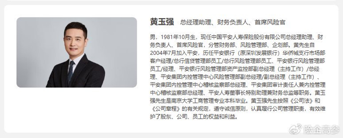 9月15日,《險企高參》注意到,中國平安集團審計責任人黃玉強已出任平安人壽總經理助理、財務負責人、首席風險官,分管財務部、風險管理部、企劃部。