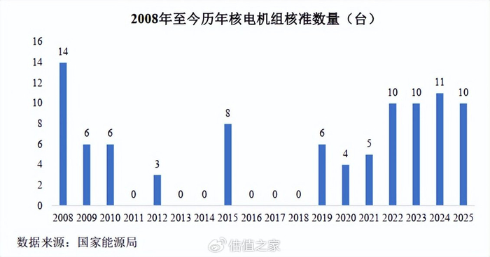 從政策端來看,國內(nèi)政策大力支持核電和天然鈾產(chǎn)業(yè)發(fā)展,在推動實現(xiàn)雙碳目標(biāo)下,我國相繼發(fā)布《關(guān)于完整準(zhǔn)確全面貫徹新發(fā)展理念做好碳達峰碳中和工作的意見》《2030年前碳達峰行動方案》等政策文件,強調(diào)“積極安全有序發(fā)展核電”并提出一系列具體措施;此外,“十四五”規(guī)劃相關(guān)文件提出積極有序推進沿海三代核電建設(shè),屆時核電運行裝機容量達到7000萬千瓦。值得一提的是,近年來國內(nèi)核準(zhǔn)機組數(shù)量有所增加,將對天然鈾產(chǎn)業(yè)持續(xù)穩(wěn)定發(fā)展提供充足市場空間:今年年內(nèi)已核準(zhǔn)10臺核電機組,已持平于2022年和2023年全年,且較2021年及之前多年大幅增長。截至2024年底,國內(nèi)在建核電機組數(shù)量和總裝機容量均保持世界第一,商運核電機組數(shù)量位居全球第二,核電市場規(guī)模巨大,鈾產(chǎn)業(yè)發(fā)展持續(xù)受益。